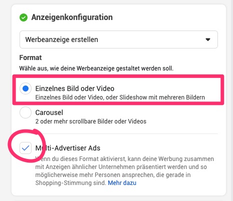 Bei der Anzeigenkonfiguration wähle einzelnes Bild und lass „Multi-Advertiser Ads“ an