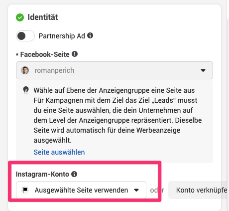Instagram-Konto ist kein muss und kann ausgelassen werden. Deine Anzeigen können trotzdem auch auf Instagram ausgespielt werden.