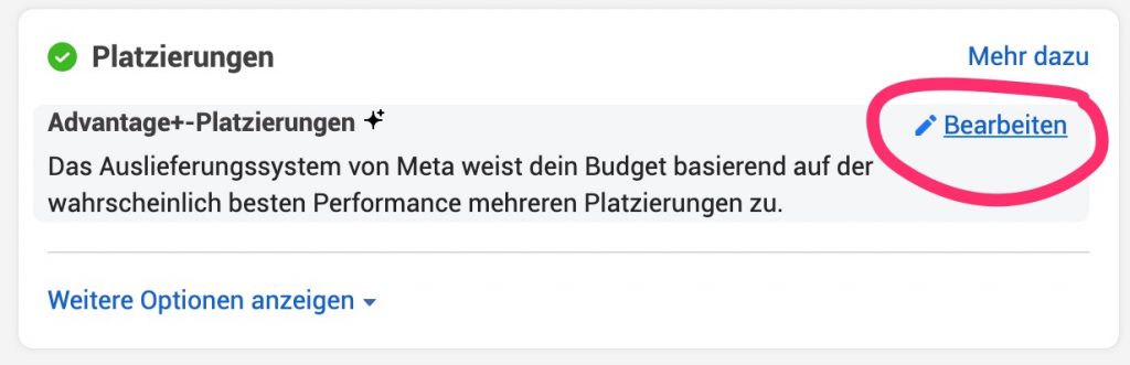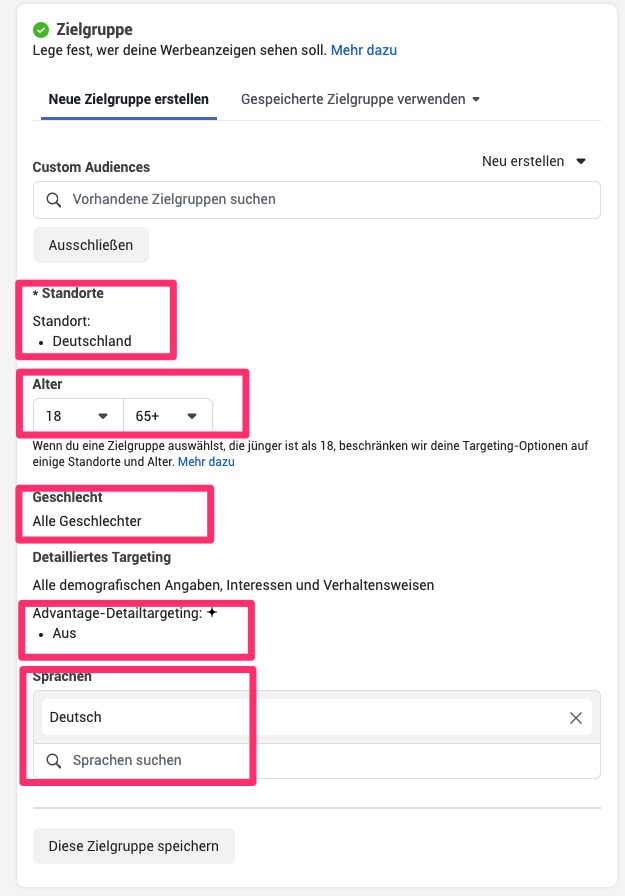 Die Zielgruppe wird häufig stark eingeschränkt. Meine Empfehlung ist, die Zielgruppe erst mal offen zu lassen, da Meta selbst passende Personen findet.
