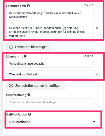Hier hast du die Möglichkeit, mehrere Primärtexte sowie Überschriften zu definieren.