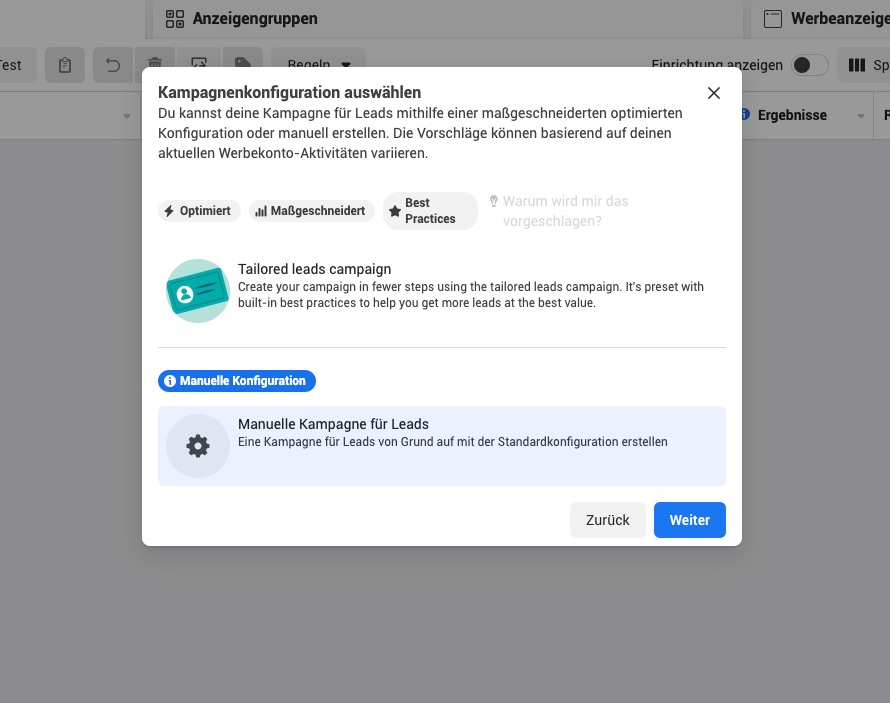 Meta möchte , dass du „tailored“ auswählst, wir gehen aber auf manuelle Konfiguration.