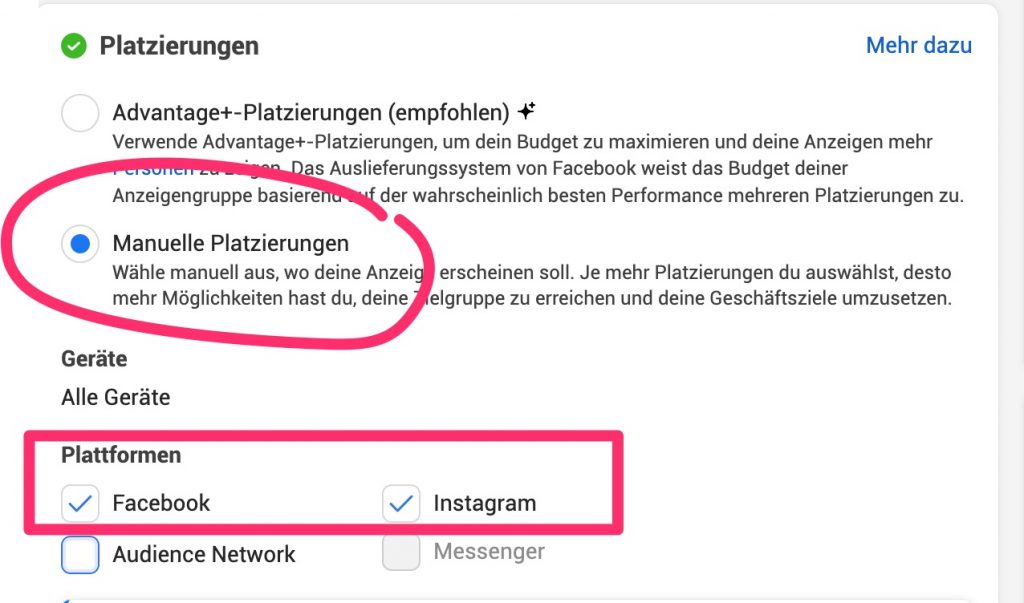 Wähle „Manuelle Platzierung“ und aktiviere nur „Facebook“ und „Instagram“.