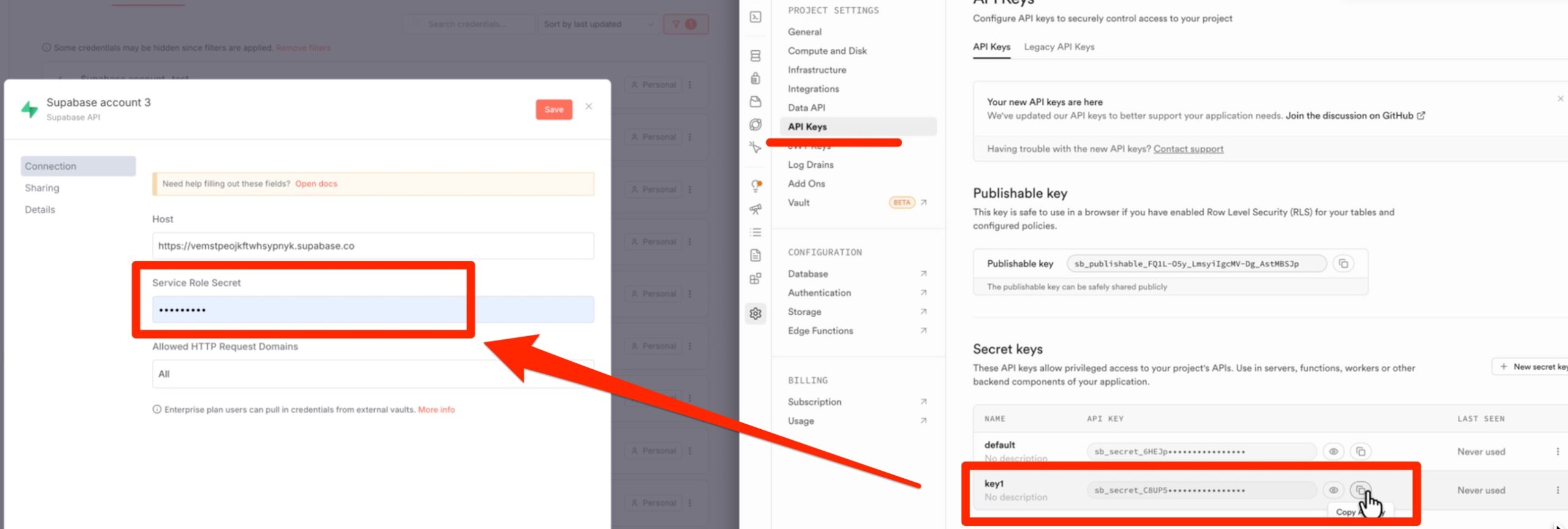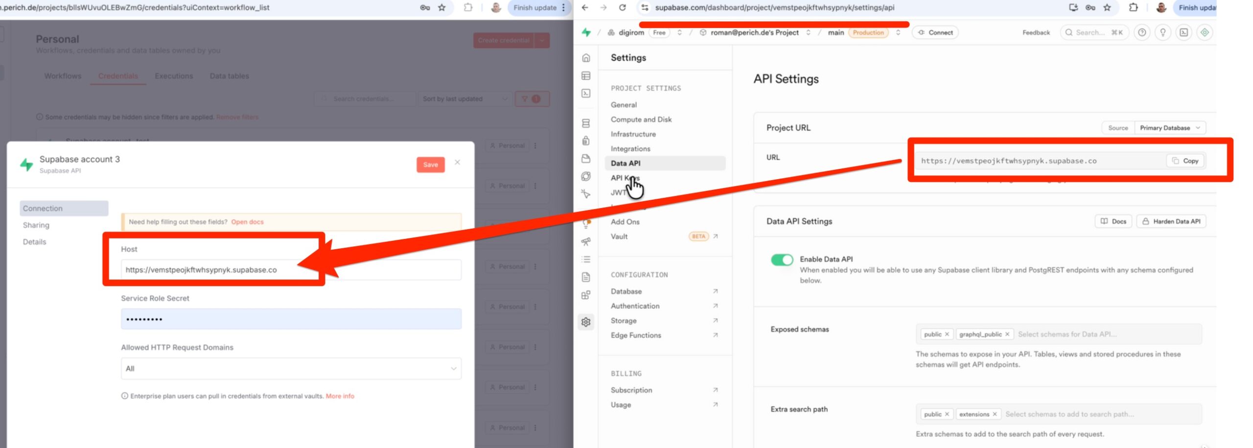 Um N8N mit Supabase zu verbinden, benötigen wir Host/URL und API-Key.